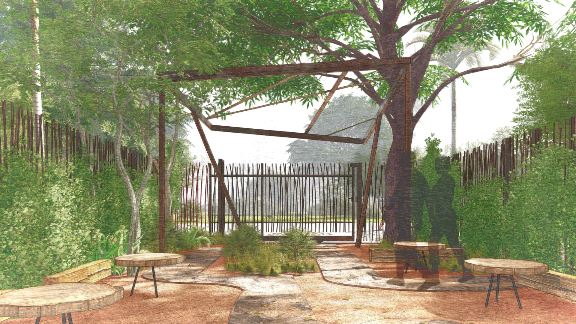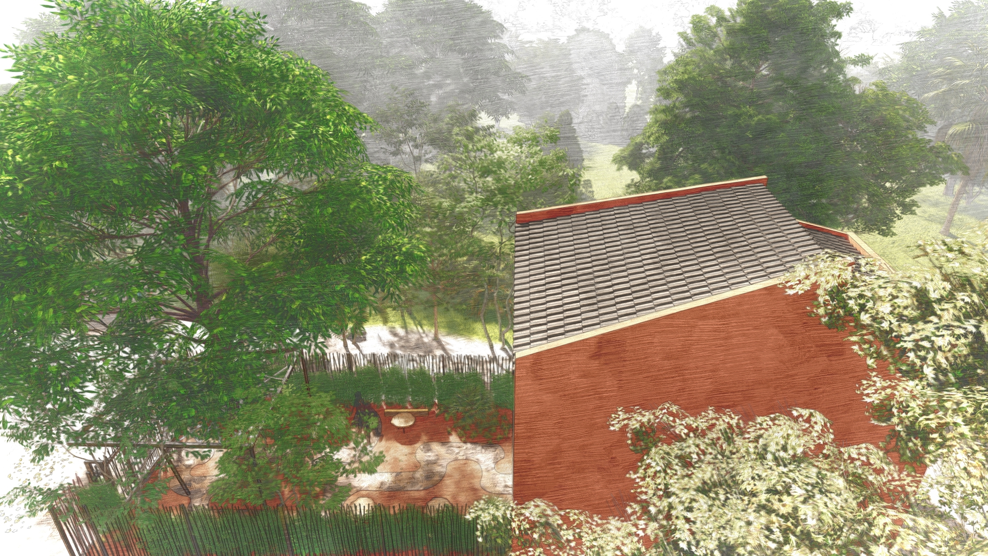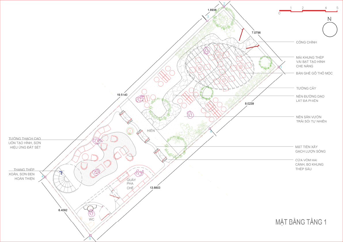 Tổng thể dự án với vườn rộng nằm trọn vẹn dưới những tán cây lớn, đổ bóng mát xuống lối đi rải đá rối tự nhiên dẫn từ cổng, dẫn dắt trải nghiệm dạo qua các khu vực ngồi café trong sân vườn. Đường dẫn lấy cảm hứng từ đường hầm ngoằn nghèo dưới lòng địa đạo. Khu vực ngồi ngoài trời làm nền đầm đất nện, bàn ghế mặt gỗ, chân sắt tái chế.