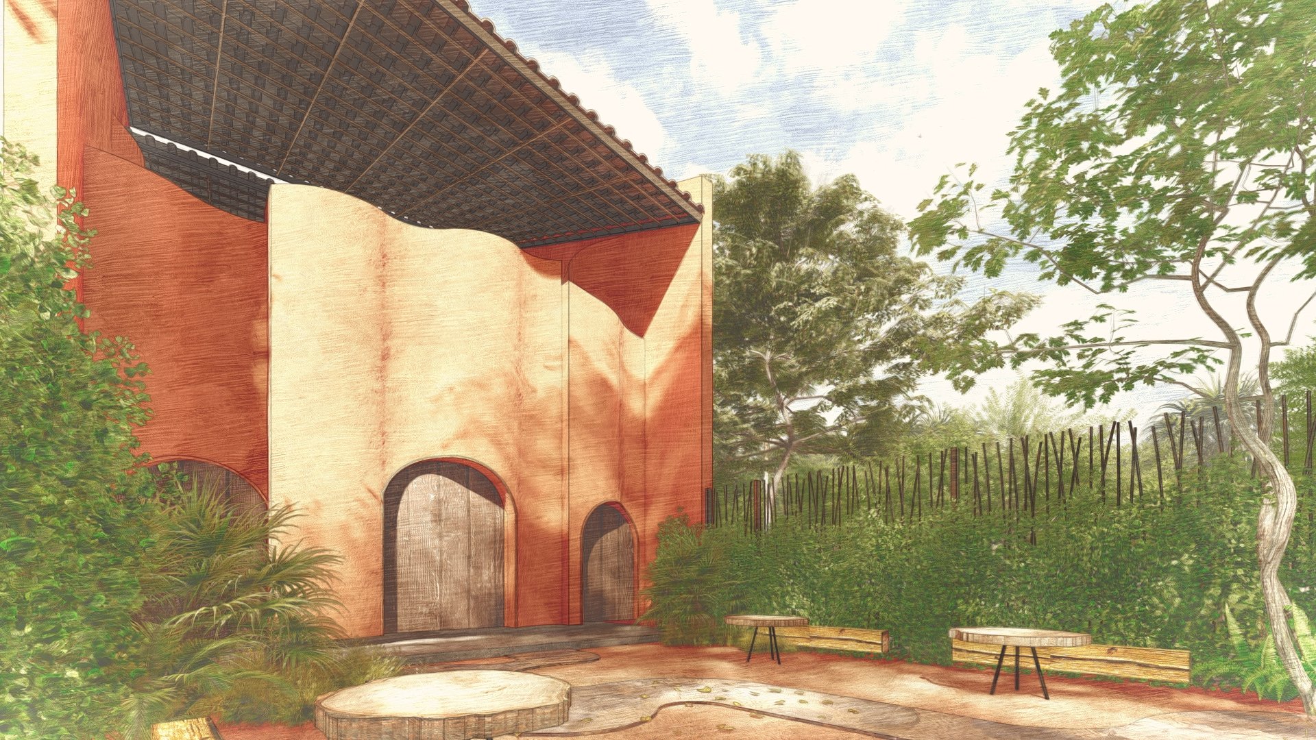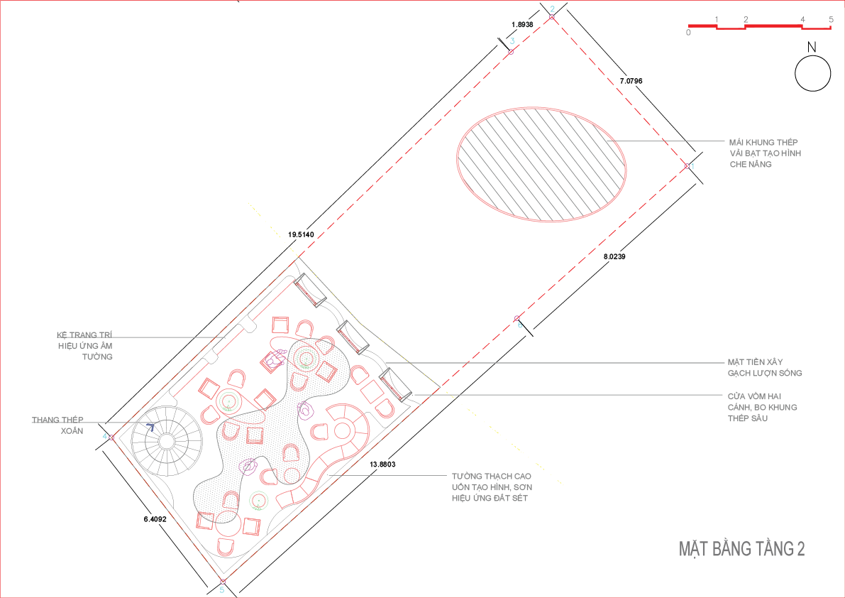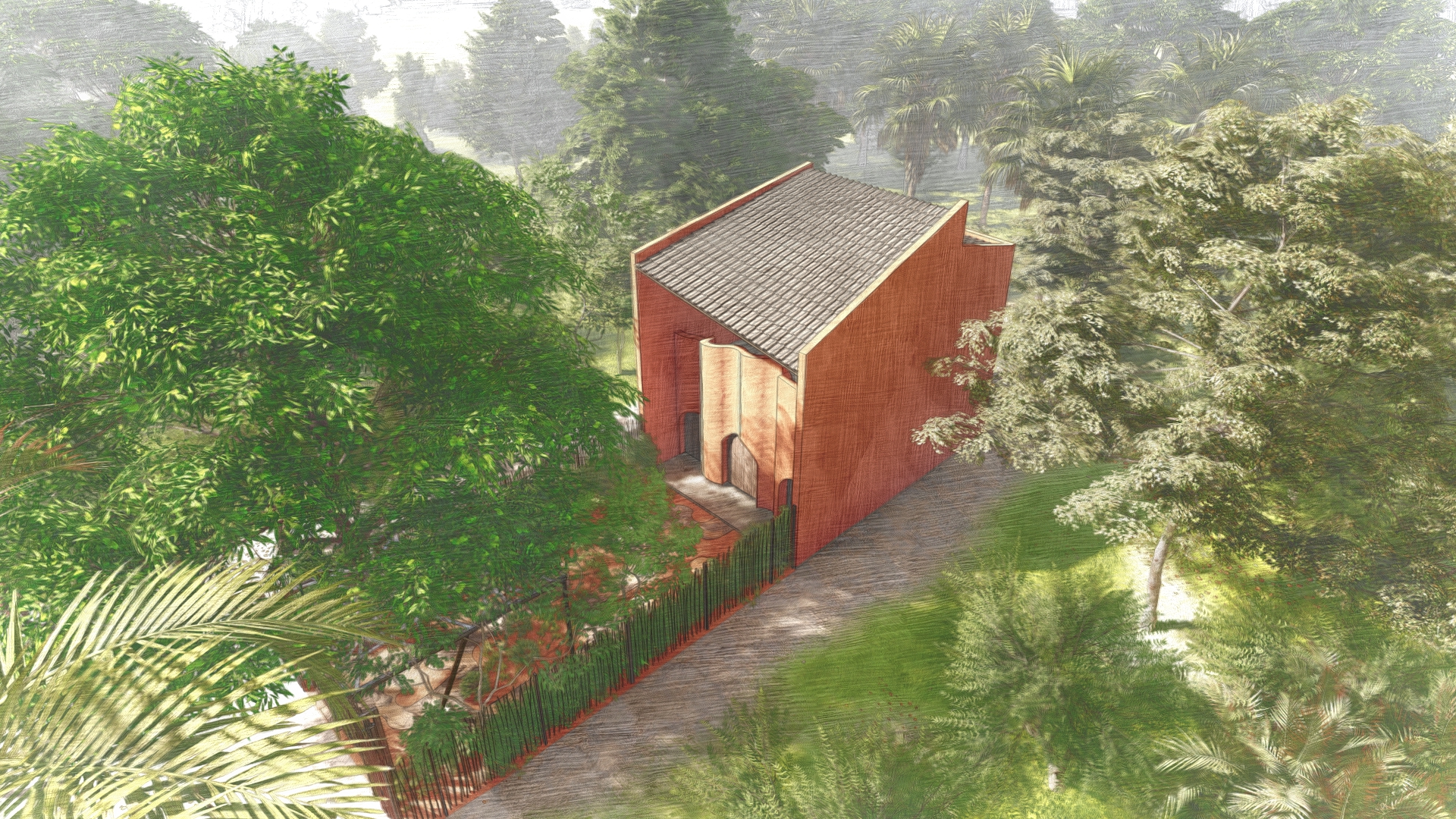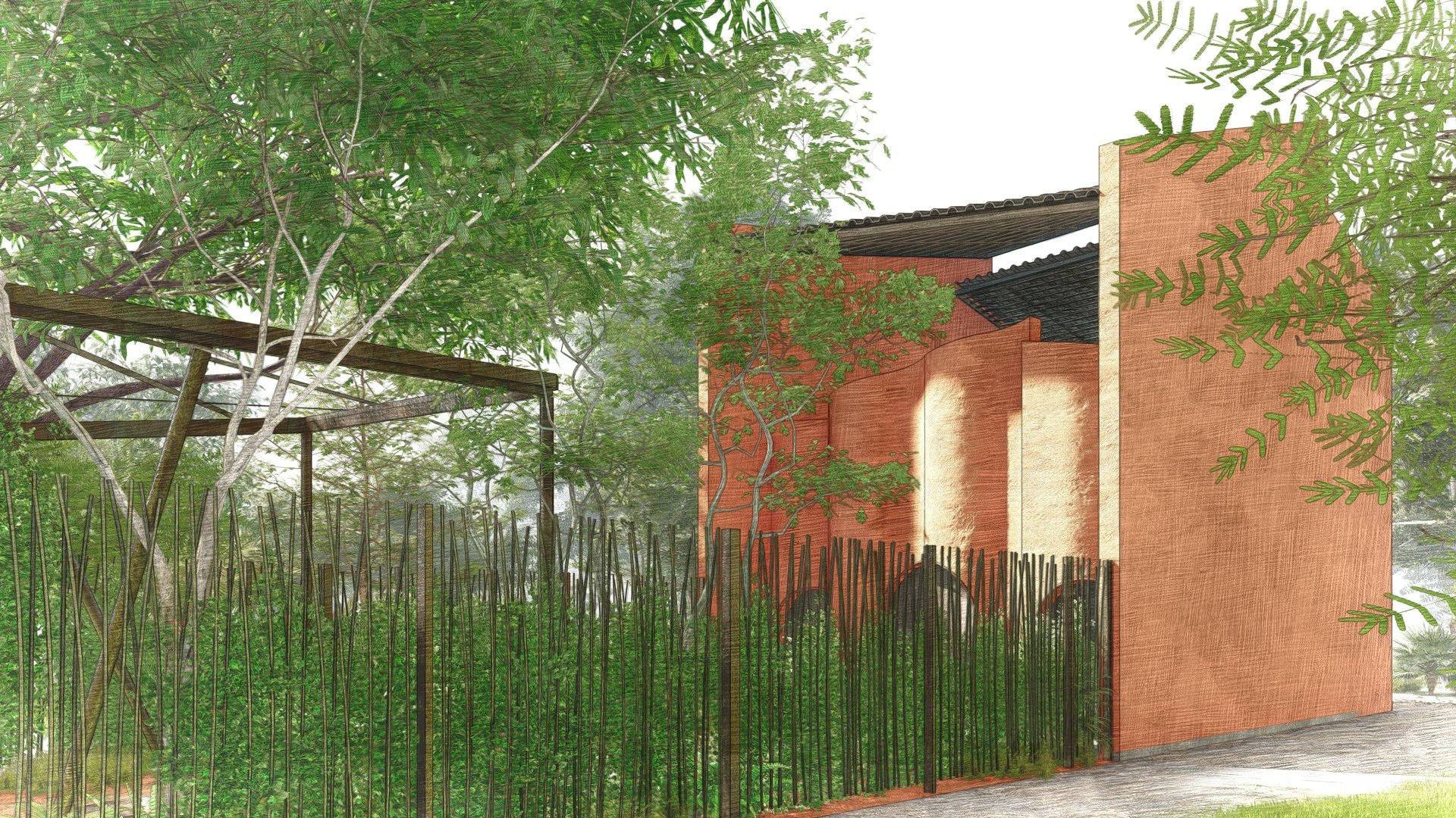 Quán café được xây bằng tường đất trình với tông màu đất đỏ cam bản địa. Các mảng tường tạo hình lượn cong mềm mại, lấy cảm hứng từ những viên ngói nung tại chỗ, chiều cao tường mặt tiền dừng lại lưng chừng giữa tầng 2 đóng vai trò làm ban công, đồng thời để tách khối tường với mái dốc vươn rộng che kín hiên ngồi. Mái ngói gợi nhắc về sự thân thuộc với nếp mái của người dân địa phương đã có từ nhiều chục năm, kết hợp với độ nghiêng vát rất riêng và mặt tiền nhà uốn cong điểm nhấn là yếu tố làm cho công trình dù hiện đại, ấn tượng nhưng vẫn mang chất cảm mộc mạc, và đâu đó ta vẫn còn nhận được mùi vị đất của thị trấn Phiên An thuở nào, hay xa hơn nữa là vùng văn hóa của người Khmer hàng ngàn năm về trước.